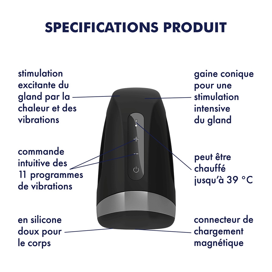 Le masturbateur chauffant Heat Vibration de la marque Satisfyer est un sextoy masculin innovant qui combine chaleur réaliste, vibrations puissantes et confort haut de gamme. Pensé pour stimuler intensément le gland, il reproduit une sensation proche de la chaleur corporelle afin de décupler le plaisir.