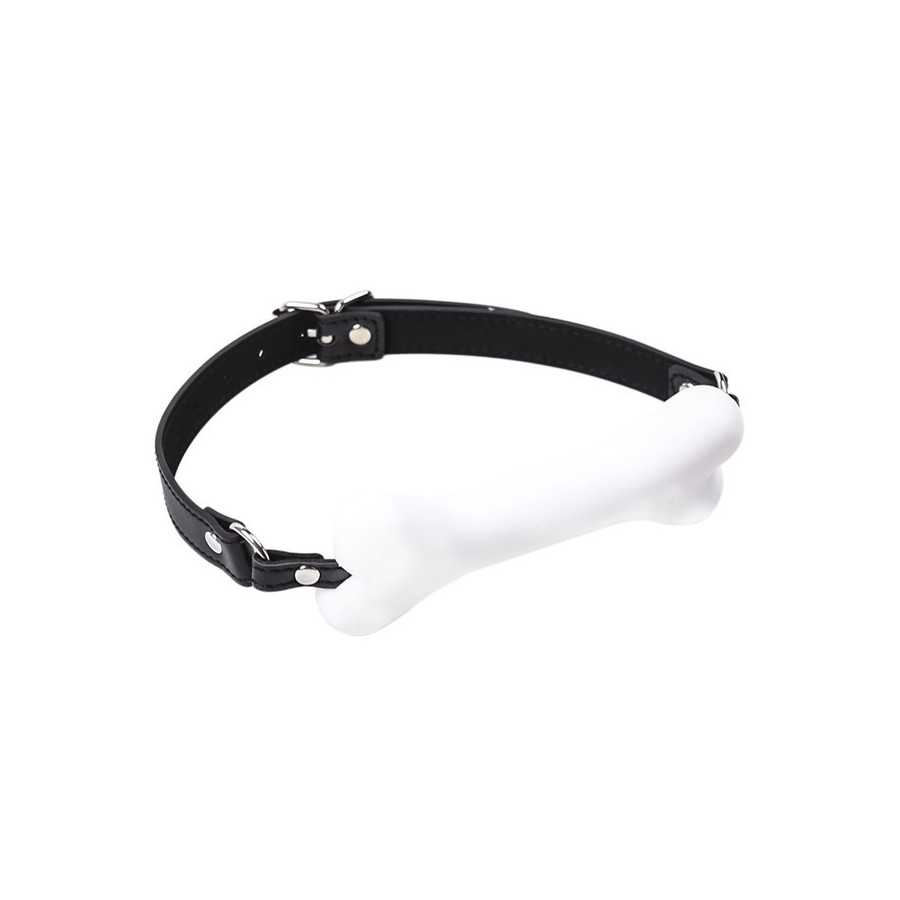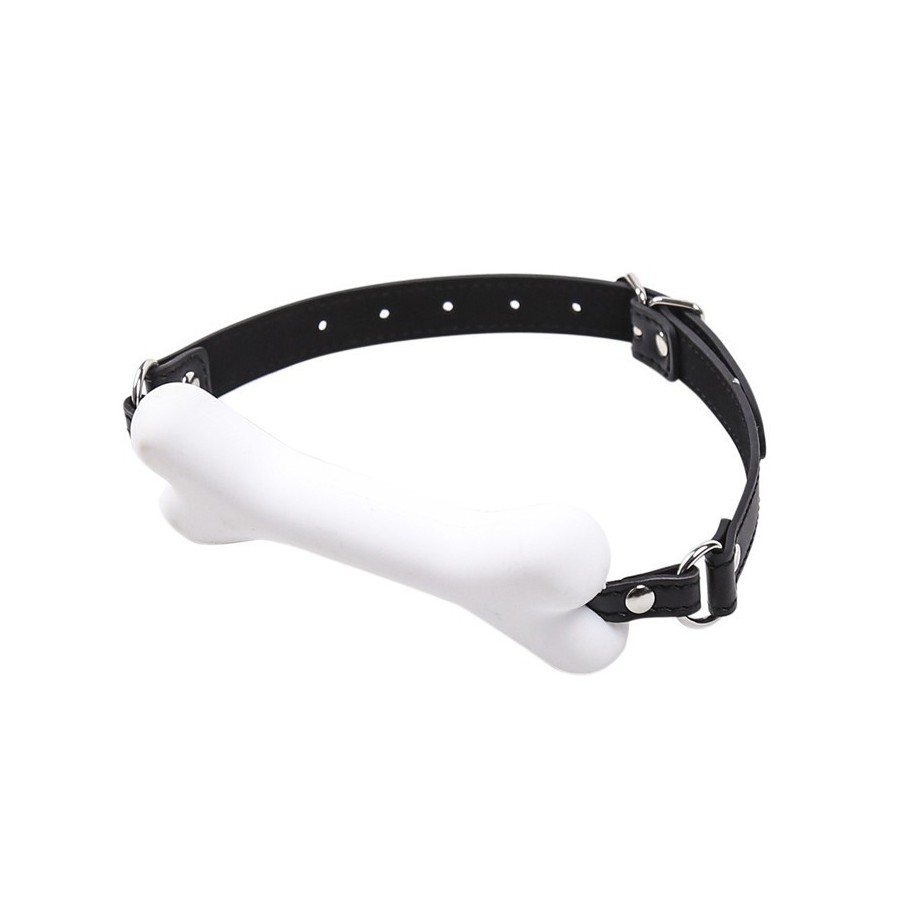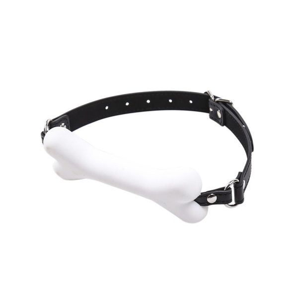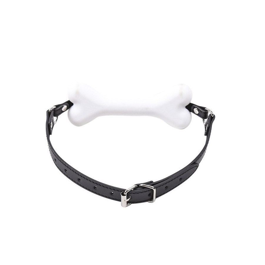 Baillon SM avec mouth gag en forme d’os blanc.